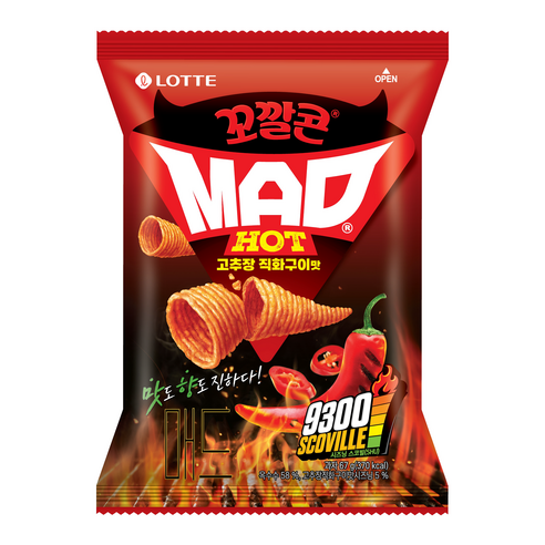 롯데 깔콘 매드핫 67g / 134g / Lotte Kokkal Corn Mad Hot 67g / 134g / 로테 콕카르코 맛드핫트 67g / 134g / 乐天 玉米锥 火辣味 67g / 134g 빠른 하이라이트 스코빌 9300의 매운맛이 나...