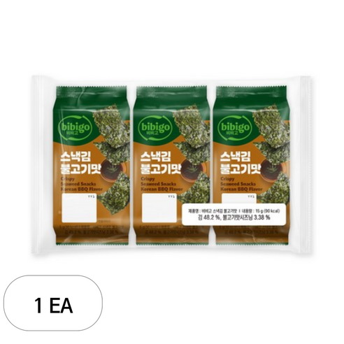 전체 세부 정보 보기CJ 비비고 바삭한 김 스낵 참기름맛 · 한국식 바비큐맛 5g × 3개