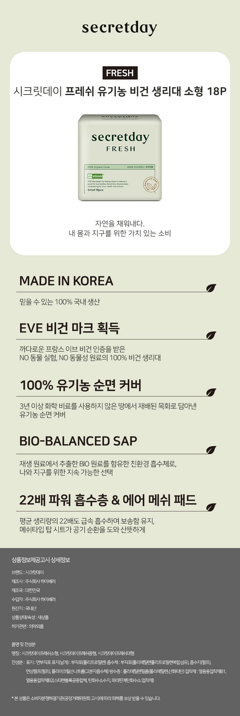 Korean: 생리대 시크릿데이 프레쉬 (소형 18P / 중형 16P / 대형 14P / 슈퍼롱 8P)