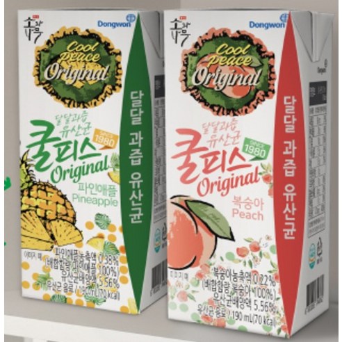 DW Coolpis (Peach / Pineapple) 190ml Quick Highlight 清爽甜美的韩国酸奶风味果汁饮料,提供蜜桃与菠萝两种口味。 Description DW Coolpis 是韩国非常受欢迎的酸奶风味水果饮料。 口感柔和、香甜顺滑,桃子与菠萝口味都带来清爽的...
